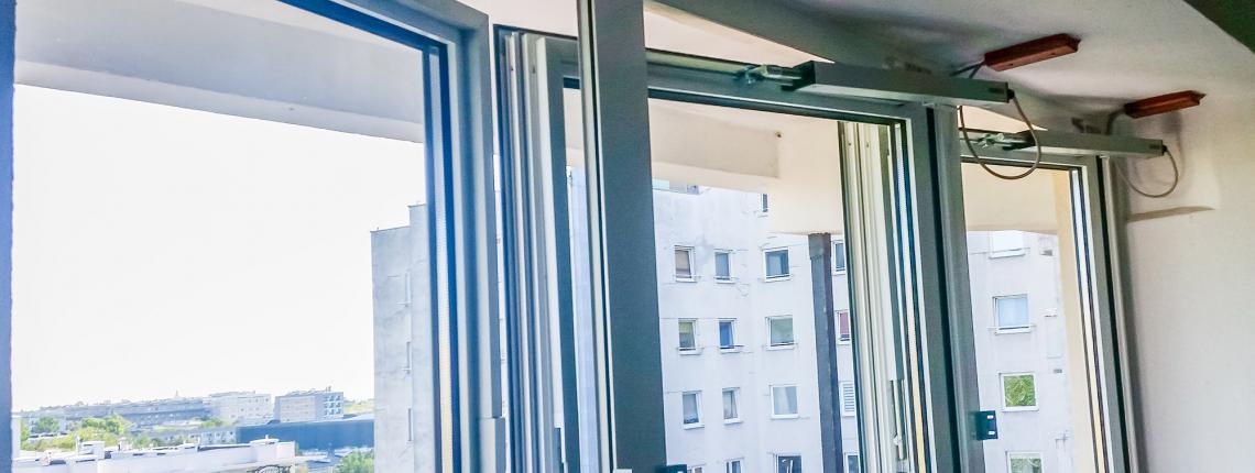 Posiadamy również w swojej ofercie okna napowietrzające i oddymiające. Przez okna napowietrzające do budynku napływa chłodne powietrze, które – na zasadzie wyporu termicznego – wypycha do góry gorące powietrze oraz produkty spalania, które następnie są odprowadzane na zewnątrz za pomocą okna oddymiającego umieszczone w górnej części budynku. Aby uzyskać dane funkcje stosujemy do okien urządzenia firmy GEZE. Kompletny zestaw urządzeń napowietrzających i oddymiających tworzy razem system oddymiania. Siłowniki elektryczne, poprzez sygnał elektryczny podany z systemu sterowania, otwierają okna. Podczas codziennych warunków eksploatacji okna służą do przewietrzania pomieszczeń.